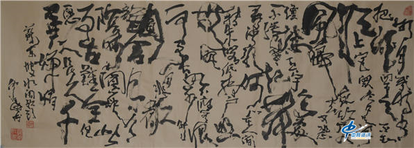 欣赏其新作,画家仲泊游以简练活泼笔墨特点与宋词意境结合,咏词随心而豪放于词家山水之间。以狂草笔法泼墨渲染的浓淡逸韵,并以干笔的晕墨的形式来表达写心为上的淡雅风趣。以内心精神世界和空间抽象思维及长锋草书入画,写成宋词之词意画。画的自由自在,如宋词中山水华滋而潇洒;一泻胸中逸气。以老到笔墨和充满激情书写宋词意境,古人云:“尚画者画境”,境即宋词;意之感受,所以,宋词画是作者心境的化迹。宋人眼中的山,宋人心中的水,宋人眼前花卉,妙画道灵而得神忘形,词是无形画;画是有意词,无画处皆成妙境。宋词灵魂是意境,笔墨以写境达意,抒发作者对宋词的情怀之境,并以书法写词于画面之中,词书画皆成一境。(文/任柯)