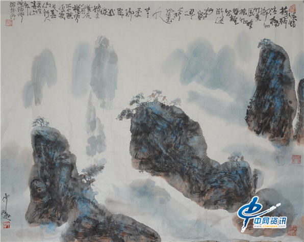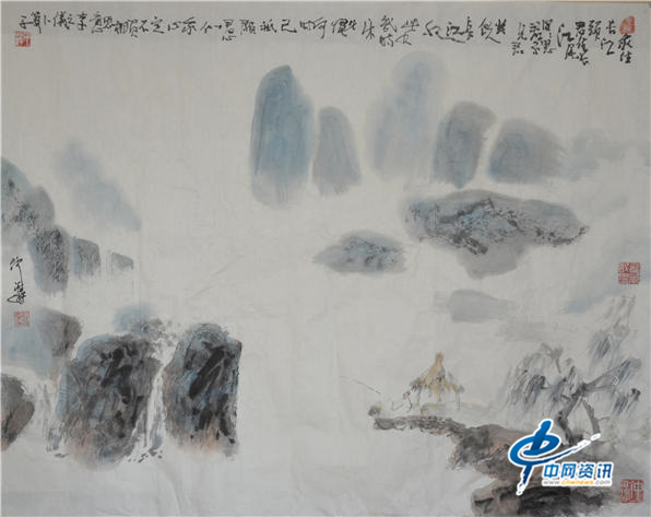 画家仲泊游与其作品宋黄庭坚山水示意图(400CM*300CM)