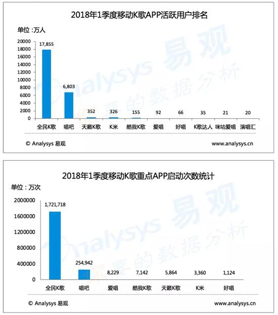 根据易观分析发布的2018年第一季度移动K歌行业数据显示,全民K歌以达1.79亿人的成绩稳坐APP活跃用户数的头把交椅。在启动次数上,全民K歌也以172.2亿次的最高成绩击败同行其他竞争对手。这些监测数据表明,全民K歌当属国内移动K歌行业的“头号玩家”。
